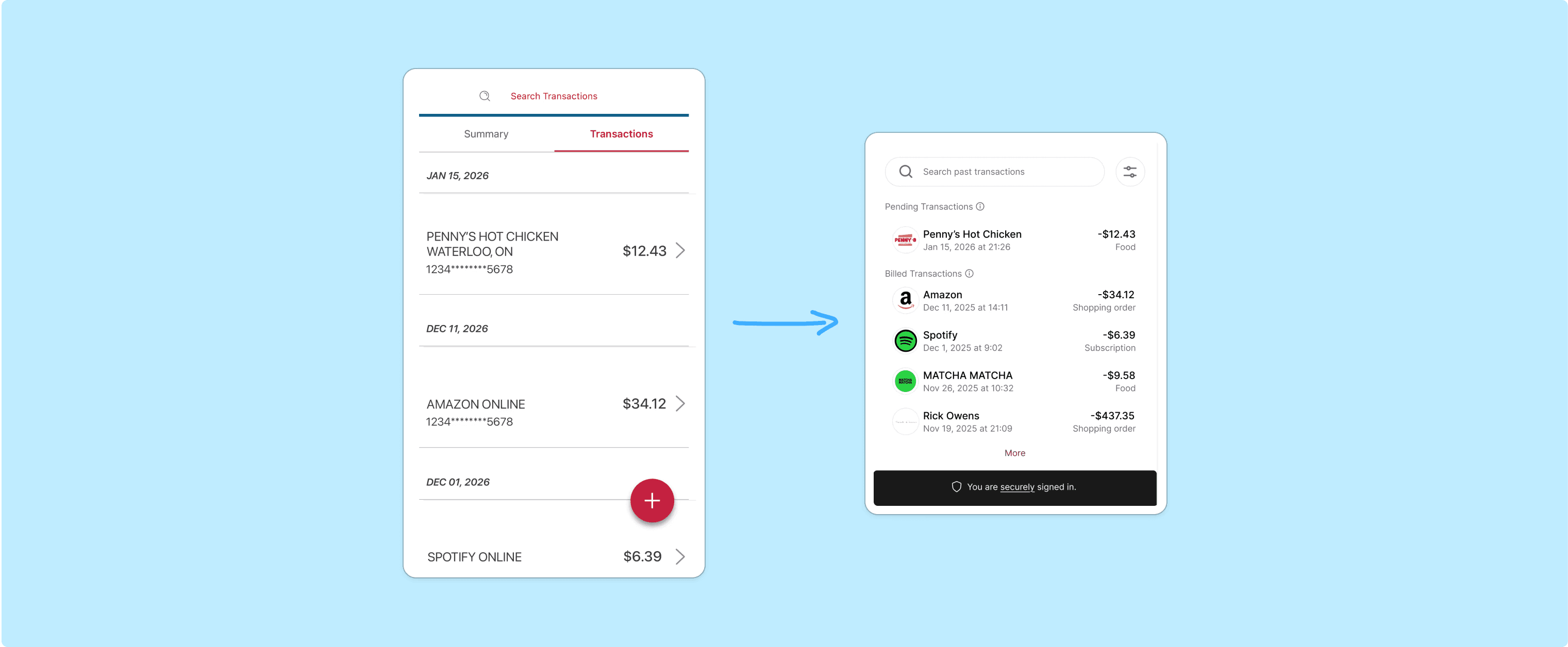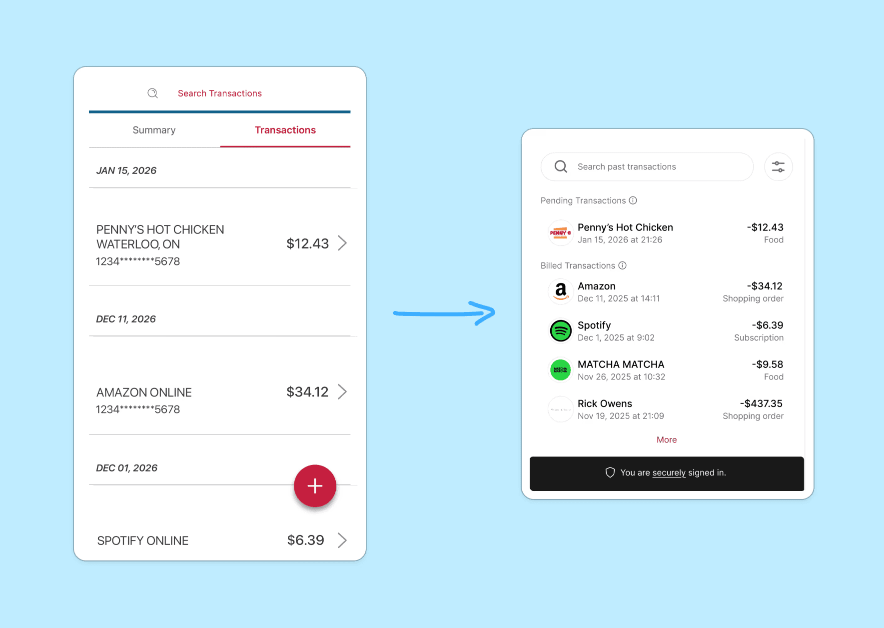 Transactions are reorganized with clearer names, category labels, and brand logos, making spending easier to scan and understand.