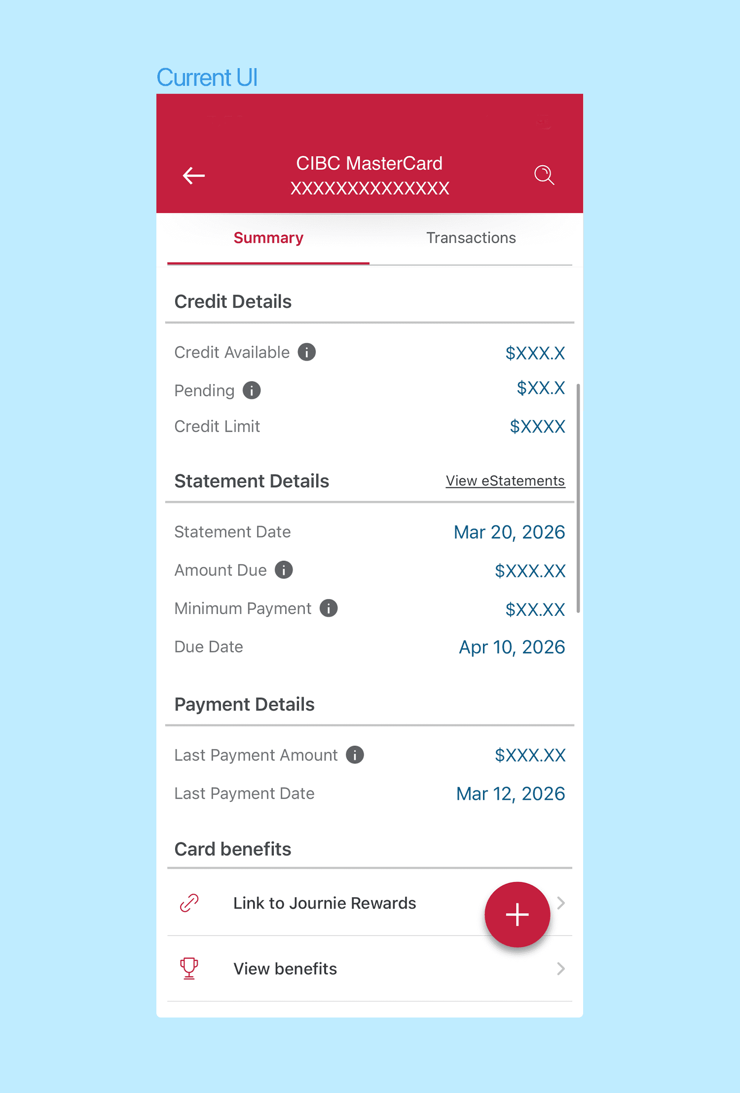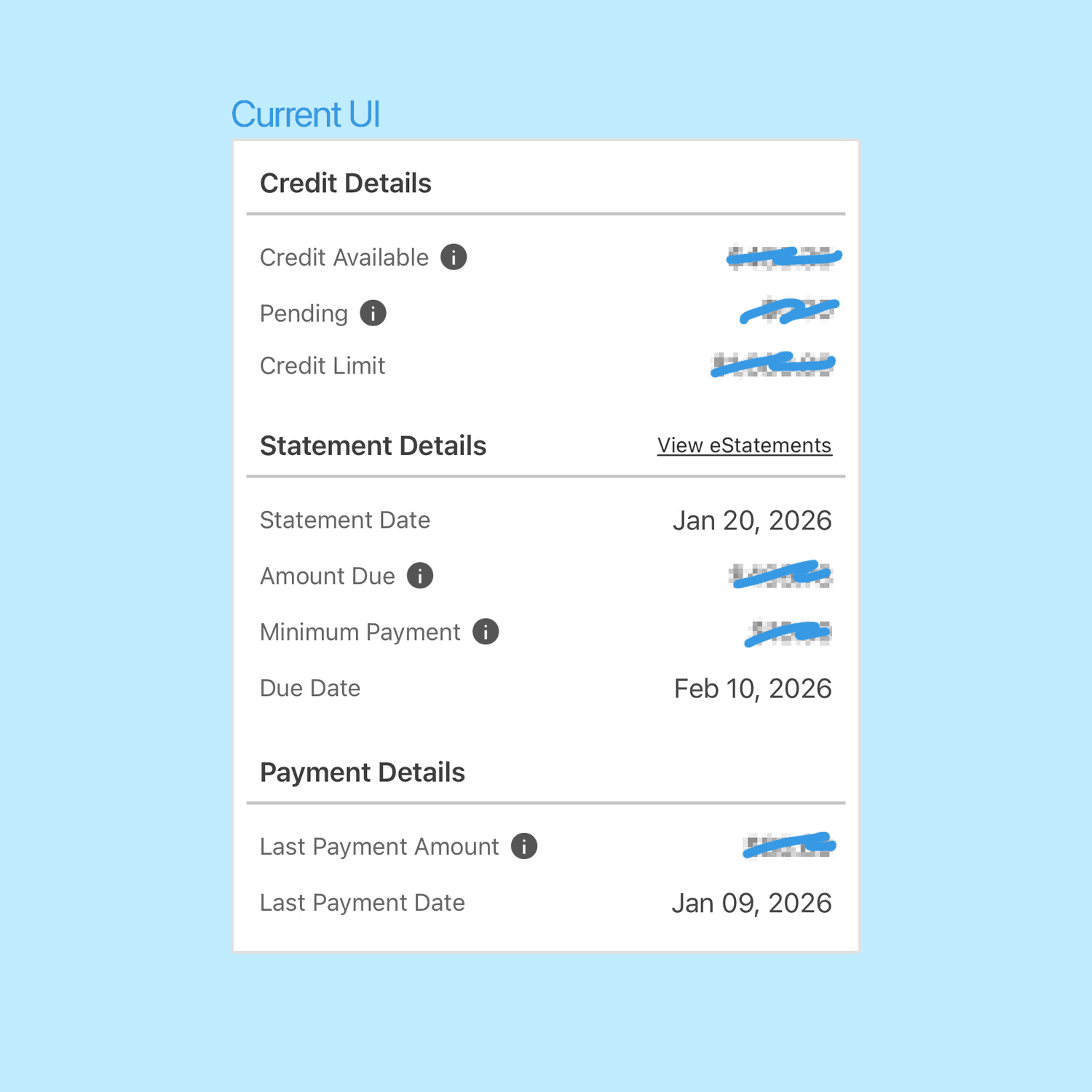 Balances, limits, due dates, and statements are shown at once with little hierarchy.