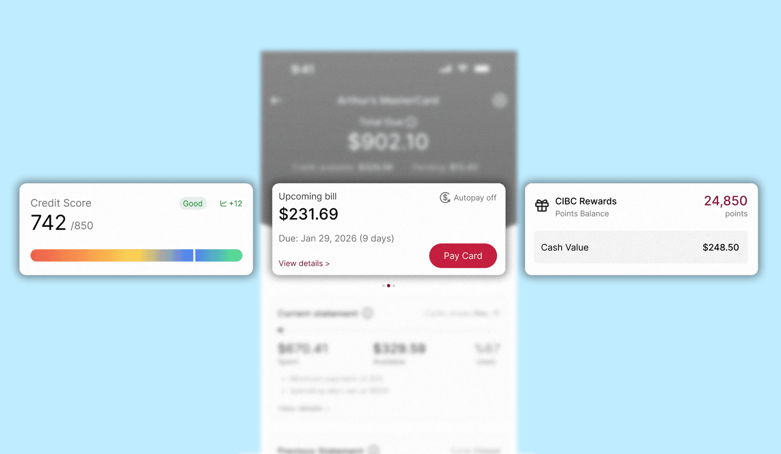 Primary actions are shown upfront through a carousel, giving quick access to pay card, view credit score, and reward points.